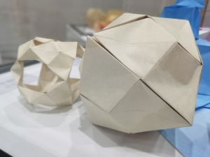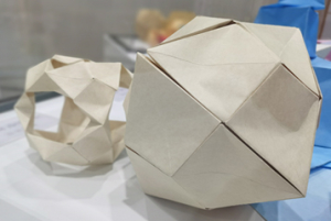 本展品是一个可以变形的多面体,可以从一个立方八面体(由八个三角形和六个四边形围成的十四面体,左图)变为一个正八面体(右图)。这种可变构型的多面体体现了单自由度多面体变换结构的设计思路,能够在柏拉图多面体与阿基米德多面体之间实现较大的体积变化,具有结构简单、易于控制的特点,在工程领域具有广泛的应用前景。