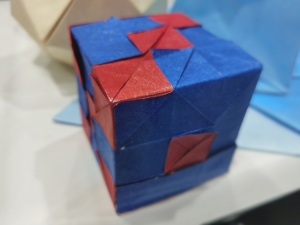 本展品仅用一张纸就模拟出骰子立方体形状及六个面不同的点数。不同时期的折纸创作者都挑战过骰子设计,本次展出的骰子其设计方案是当前公开的设计方案中纸张边缘利用率最高的方案。(注:纸张边缘利用率=连接所有“形状的边界”的最短连续闭合曲线的长度/纸张边缘的周长)
