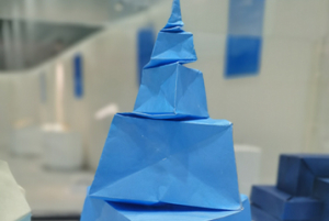本展品是对基于三角形的可平折纸管结构的变形,各层可以完全扭转立起,形成内部中空的三角锥状,也可以每隔一层立起一层,像是形成连续多层的展示台,形成错落的美感。
