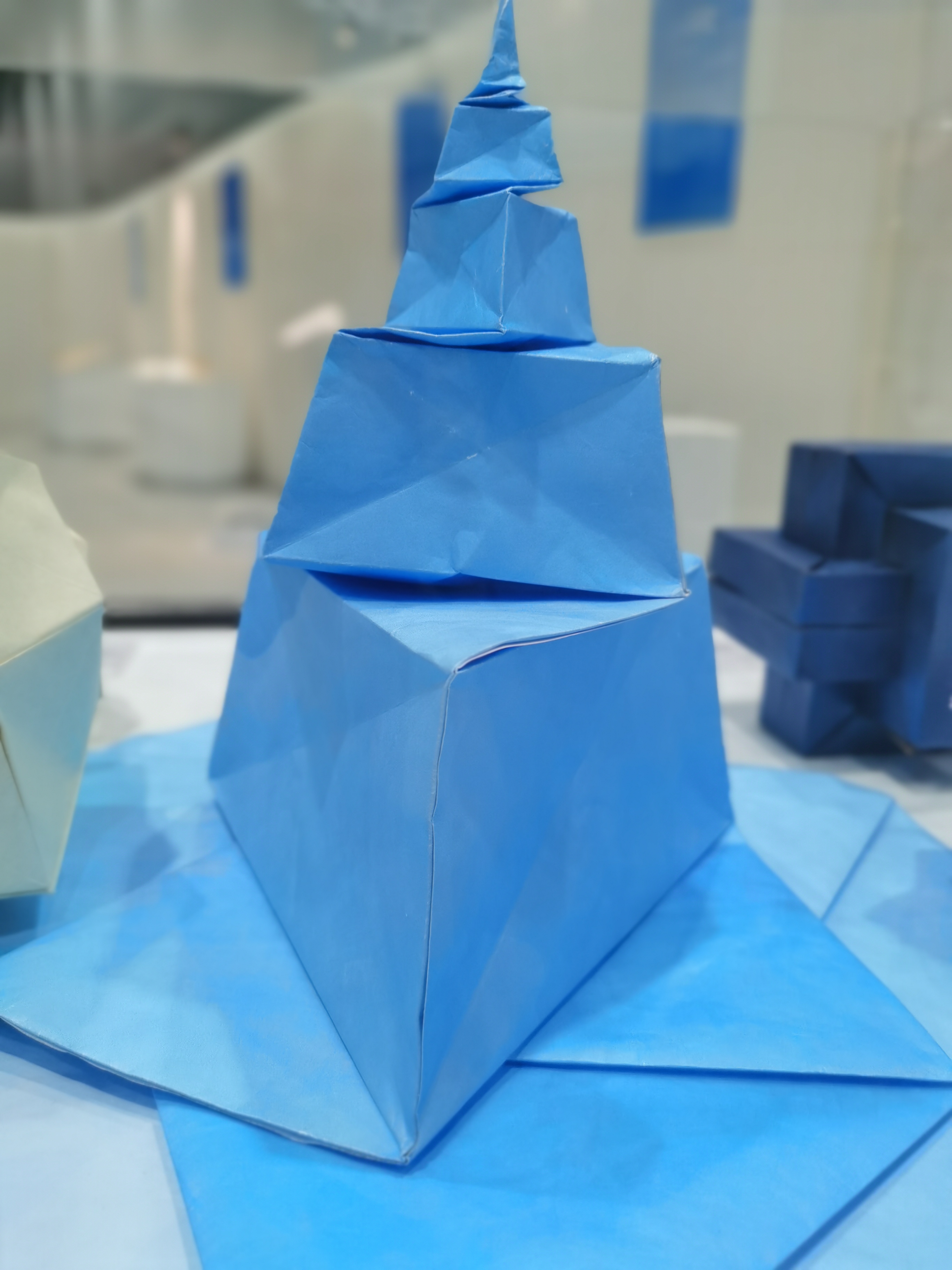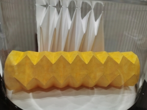 可伸缩的纸管结构(上)有利于在包装运输过程中分散冲击力,提高安全性能。本展品所示的管状结构是基于正方形的45度角设计的,具有平折性,V型褶的设计带来整齐的螺旋形伸缩变化,具有很好的缓冲性。