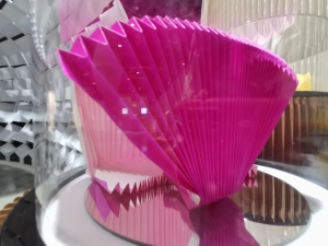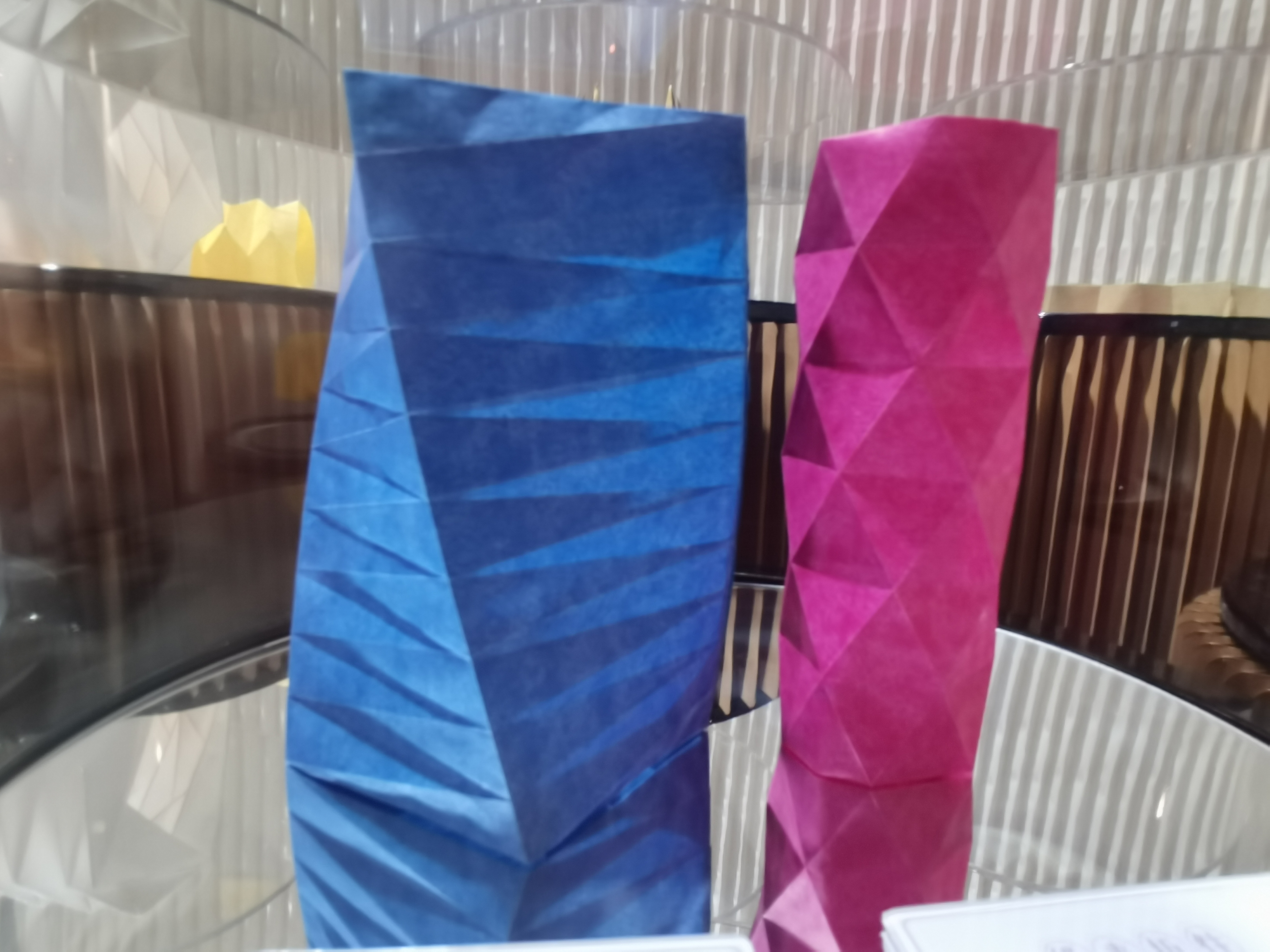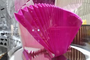 本展品主要通过一系列整齐的风琴褶营造了一个可变形的空间,在折角处创造性使用V型褶,能够增强空间塑性的灵活多变。风琴褶越长,可以构造的空间越多样。