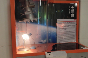 太阳帆这件展品当观众按动按纽之后,激光器会向金属小(义)发射激光,小(义)接受到激光之后会转动起来。