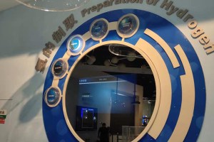 氢的制取这件展品分成了两个部分,,其中之一是操作台以及后面的视频显示,观众可以转动操作台上的转盘选择其中一种制氢方式,在视频当中进行了解。