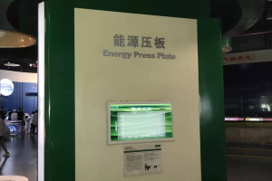 能源压板这件展品由两部分所组成,一个是操作台和后面的视频显示,当观众将双手按在压板上的时候,压板下面的压力传感器可以将我们的压力转化成经济发展的速度,通过视频我们可以了解到经济发展的速度与适合我们消耗的能源有紧密的关系。