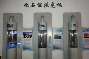 展项由三个柱形容器组成,它们分别代表煤炭、石油和天然气,在柱形容器的周围会有刻度指示代表三种化石能源它们目前的存储量。