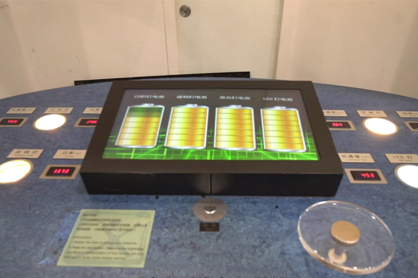 游客还可以用手去操作操作台上的圆盘,指针指到对应的年份来观察这三种化石源还可以使用多少年,当圆盘指向任意一个年代上面的画面,就会随着圆盘显示的年份进行变化会显出煤炭、石油、天然气这三种化石能源还有多少余量。