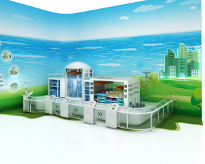 观众通过观看镶嵌在反应堆内的回路、堆腔注水、交换器、压力容器的LED屏幕,了解每个部件的工作方式和流程,通过操作四个展台上的按钮或者推杆,分别启动相应的工作步骤,了解华龙一号是如何工作的。