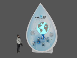分别转动上、下控制阀,将“地球(屏幕)”上的代表总水量的“小球”分别注入到左右两个大桶(97.5%和2.5%),和左右两个小桶中(90%和10%)。展示地球总水量中,海水与水资源之间、以及可利用水资源与不可利用水资源之间的巨大差异,引发思考,进而提高节水意识。