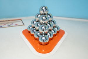 用桌上所有的球,在三角形的基座上搭建金字塔。该展品是拓扑学的一个应用。拓扑学是研究几何图形或空间在连续改变形状后还能有一些性质保持不变的学科。该展品可锻炼孩子的思维, 开发智力。