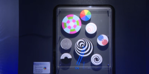 请大家先观察一下静止状态下的图案,下面我来启动按钮,这些彩色的牛顿色盘旋转到一定速度时,由于人眼的视觉暂留效应,原来的彩色转盘会变成白色的;而贝汉转盘则与牛顿转盘相反,这个转盘只有黑白两色,但它在旋转时,人会看到其它颜色,而且每人看到的颜色各不相同!