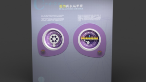 这件展项演示的就是数学中最为常见的图形——圆的特性。展项由两组圆盘互动装置构成,左边装置演示周长与圆周率,右边装置演示周长与半径。