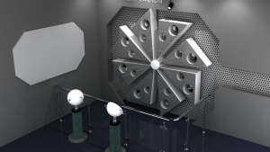 我们都知道,夏天的时候穿白色的衣服较为凉快,这是因为黑色较为吸热。当我们按下手中的启动按钮,聚光灯打出一束强光,对准光轮叶片,也可调整平面镜角度,反射上方聚光灯的光线到光轮叶片上。