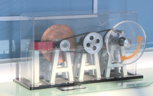 我们来看面前的这个展品,它复原了当年法拉第的圆盘发电机,展项由转轮、磁铁和铜盘等组成,我们可以把圆盘看作是由无数根长度等于半径的紫铜辐条组成的,通过转轮转动铜盘时,每根辐条都做切割磁感线的运动,从而产生感应电动势,当辐条转到某一位置时,辐条和外电路中的电流表恰好构成闭合电路,电路中便有电流产生了。