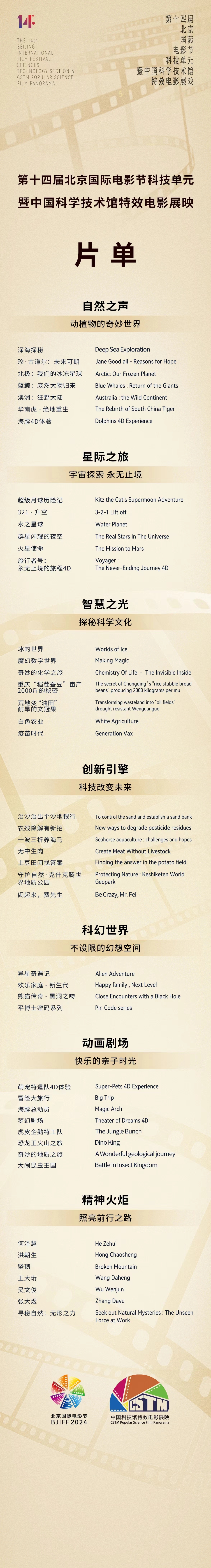 本届电影节科技单元展映影片囊括自然、成长、农业、太空等丰富题材,覆盖全年龄段观影需求,欢迎广大电影爱好者、科技爱好者和亲子家庭前往观影,体验从微观世界到宏观宇宙的穿越之旅,共同品味这场视觉与思想的饕餮盛宴。