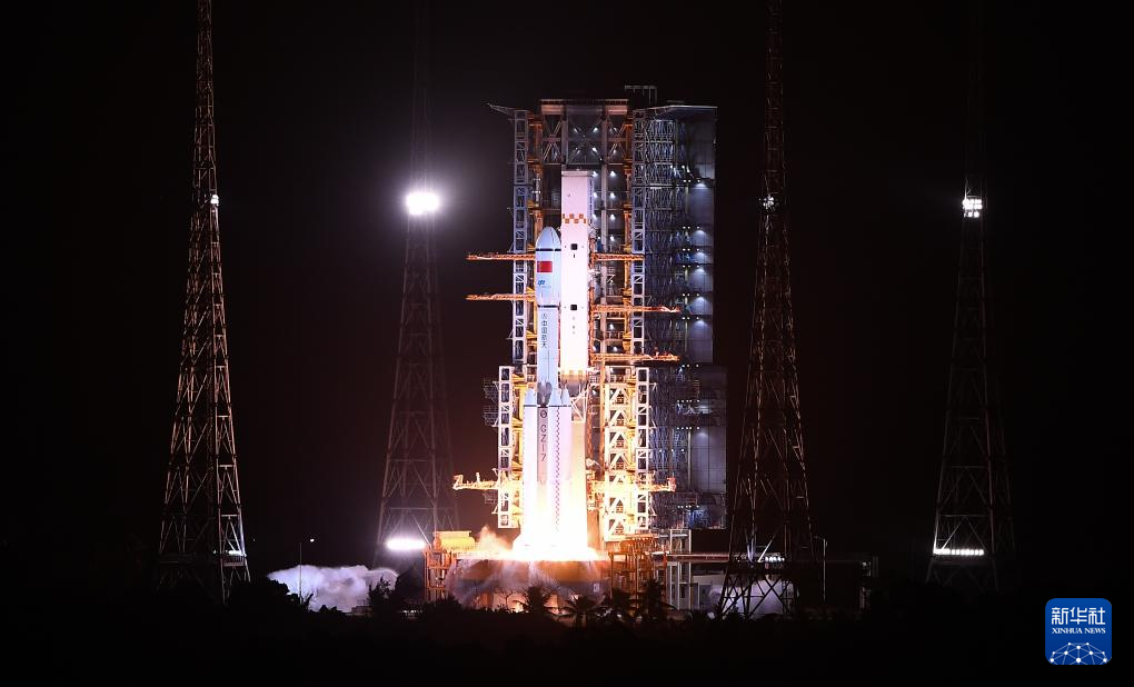 不远处的海岸线上,长七遥八运载火箭在灯光的映照下,正准备将天舟七号货运飞船送入太空。这名"太空快递员"即将为中国空间站送去新的补给。