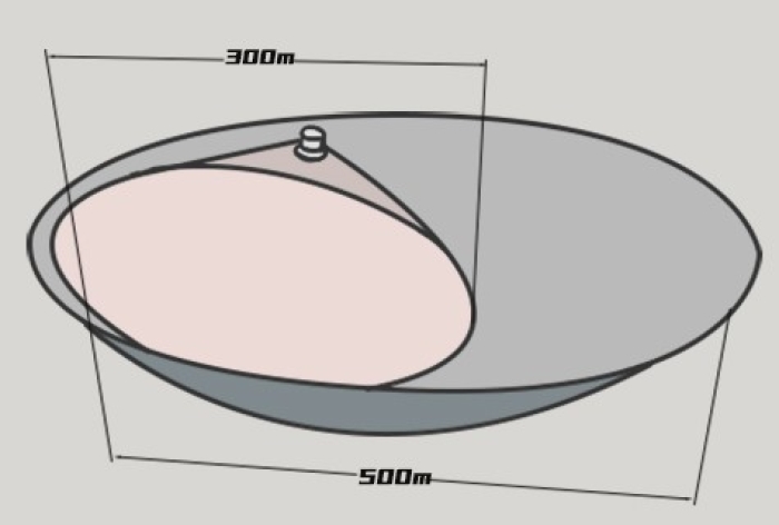 由可控制单元块拼接组成的FAST 500米口径球冠型反射面,不仅仅可以躺着不动进行观测,也能够把其中300米范围变换成一个可转动的抛物面镜做全转向式观测(比当今世界最大全转向射电望远镜100米级也大了200米)。