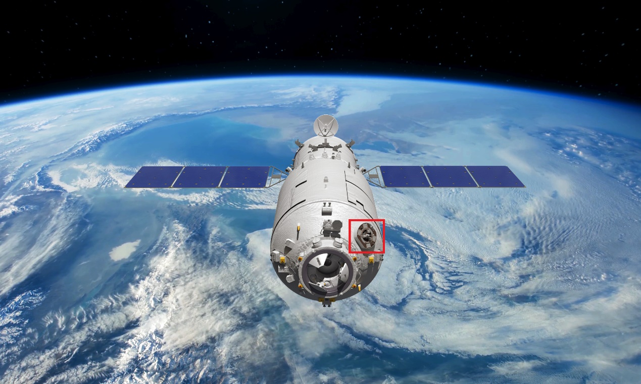 天舟二号顶端对接口附近安装有适配器,用于与核心舱天和机械臂末端执行器对接。试验开始前,机械臂爬行到节点舱附近位置,与天舟二号适配器对接,执行捕获操作。尔后,机械臂推动天舟二号与前向对接口解锁,天舟在机械臂拖动下以核心舱节点舱球心为圆心进行平面转位,转动一定角度后再回到原位。天舟二号再次与节点舱前向口对接,转位对接试验完成。