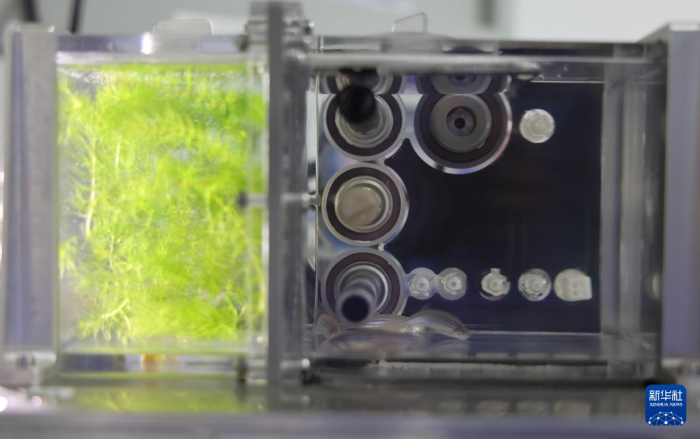 鱼类和人类一样,在太空环境中都要面对适应性的挑战。为了确保它们能过上舒适的生活,科学家们精心设计了一套生态循环系统。在位于问天舱生命生态实验柜里的小型受控生命生态实验模块中,斑马鱼、植物和微生物组成了一个完美的小团队——藻类通过光合作用产生的氧气供给斑马鱼呼吸,而斑马鱼呼出的二氧化碳又成为藻类进行光合作用的好材料,至于鱼儿们的“黄金便便”,则是藻类生长的最佳营养品。为了让太空鱼吃得健康又开心,科学家们还设计了专用鱼食,并且用注射器把食物推进到“鱼缸”里。