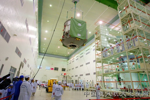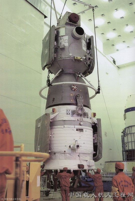 正在吊运的神舟六号飞船轨道舱(图片来源:中国载人航天工程官网)
