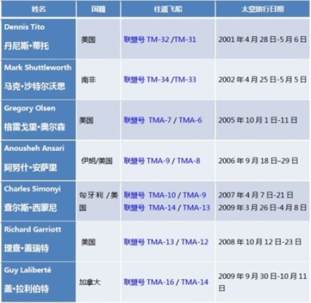2001-2009年,共计有7名太空游客8次进入国际空间站。他们为每次飞行支付的费用为2000-4000万美元。