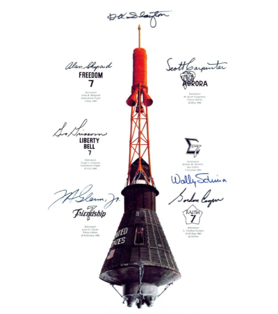 “水星”号载人飞船及其六次载人任务徽章和航天员签名(图片来源:NASA官网)