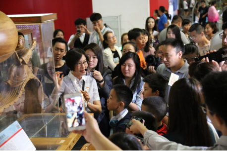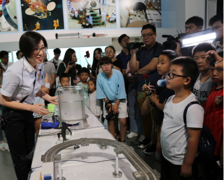 廖红首先带领观众参观了“华夏之光”展厅,通过记里鼓车和大花楼提花机等展品的讲解,介绍了中国古代科技成就及对世界文明进步所产生的重要影响。然后,在二层探索与发现展厅,廖红带他们参与体验了经典实验“怒发冲冠”和“空中自行车”展项,让观众通过亲身感受了解电磁的奥秘以及重心与平衡之间的关系等科学原理;在四层挑战与未来展厅,观众通过动手拼插运载火箭模型发射、观看神舟一号返回舱实物等展品,感受我国在航天技术和太空探索方面的伟大成就。