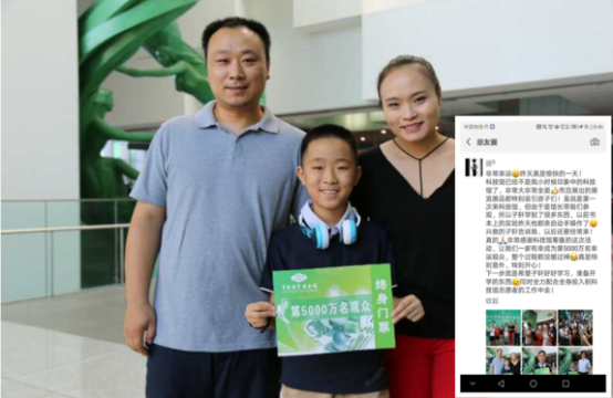 幸运观众邢伟(左一)一家三口及其在活动当天发的微信朋友圈
