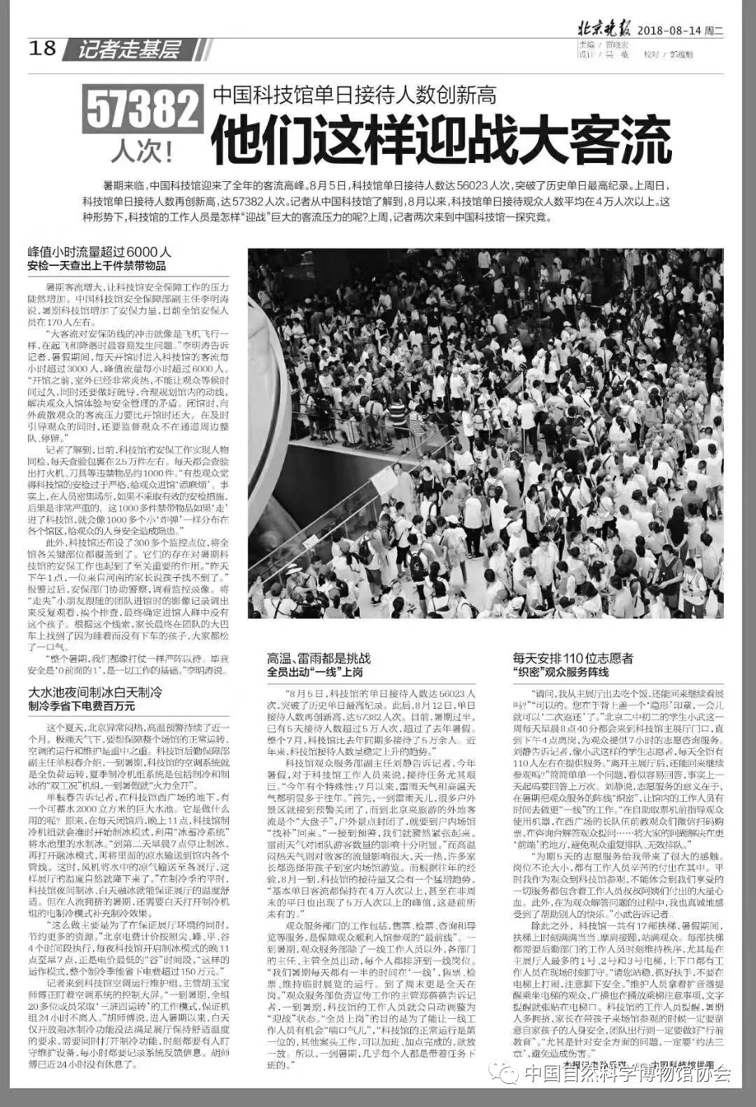 全员出动“一线”上岗“8 月 5 日,科技馆的单日接待人数达 56023 人次,突破了历史单日最高纪录。此后,8月12日,单日接待人数再创新高,达57382人次。目前,暑期过半,已有5天接待人数超过5万人次,超过了去年暑假。整个7月,科技馆比去年同期多接待了5万余人。近年来,科技馆接待人数呈稳定上升的趋势。”科技馆观众服务部副主任刘静告诉记者,今年暑假,对于科技馆工作人员来说,接待任务尤其艰巨。“今年有个特殊性:7月以来,雷雨天气和高温天气都明显多于往年。”首先,一到雷雨天儿,很多户外景区就接到预警关闭了,而到北京来旅游的外地客流是个“大盘子”,户外景点封闭了,就要到户内场馆“找补”回来。“一接到预警,我们就骤然紧张起来。雷雨天气对团队游客数量的影响十分明显。”而高温闷热天气则对散客的流量影响很大,天一热,许多家长都选择带孩子到室内场馆游览。而根据往年的经验,8月一到,科技馆的接待量又会有一个猛增趋势,“基本单日客流都保持在4万人次以上,甚至在非周末的平日也出现了5万人次以上的峰值,这是前所未有的。”