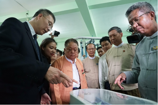 图1:中国科学技术馆馆长殷皓(左一)、缅甸民盟党名誉主席吴温吞先生(左三)、缅甸教育部部长缪登基博士(左五),正在参观体验中国流动科技馆展品。