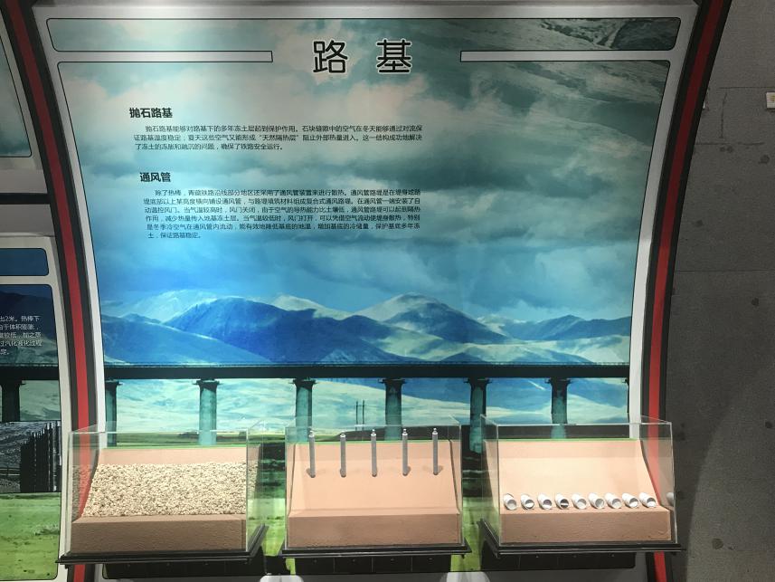 青藏铁路大部分线路处于高海拔地区和“生命禁区”,这里多年冻土的地质构造是青藏铁路建设的难题之一。为了攻克冻土难题,多名科技工作者对其进行科研攻关,中国科学家确定的解决方案中有三项重要而关键的技术:抛石路基、通风管和热棒。展览特将具有天然隔热层作用的抛石路基和具有自动温控风门功能的通风管模型进行了展出,配合图文版深入阐释其中的技术原理,让您对青藏铁路的技术难题和解决方案一目了然。