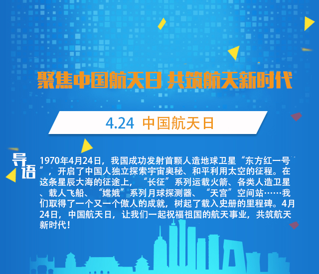 1970年4月24日,我国成功发射首颗人造地球卫星“东方红一号”,开启了中国人独立探索宇宙奥秘、和平利用太空的征程。在这条星辰大海的征途上,“长征”系列运载火箭、各类人造卫星、载人飞船、“嫦娥”系列月球探测器、“天宫”空间站……我们取得了一个又一个傲人的成就,树起了载入史册的里程碑。4月24日,中国航天日,让我们一起祝福祖国的航天事业,共筑航天新时代!