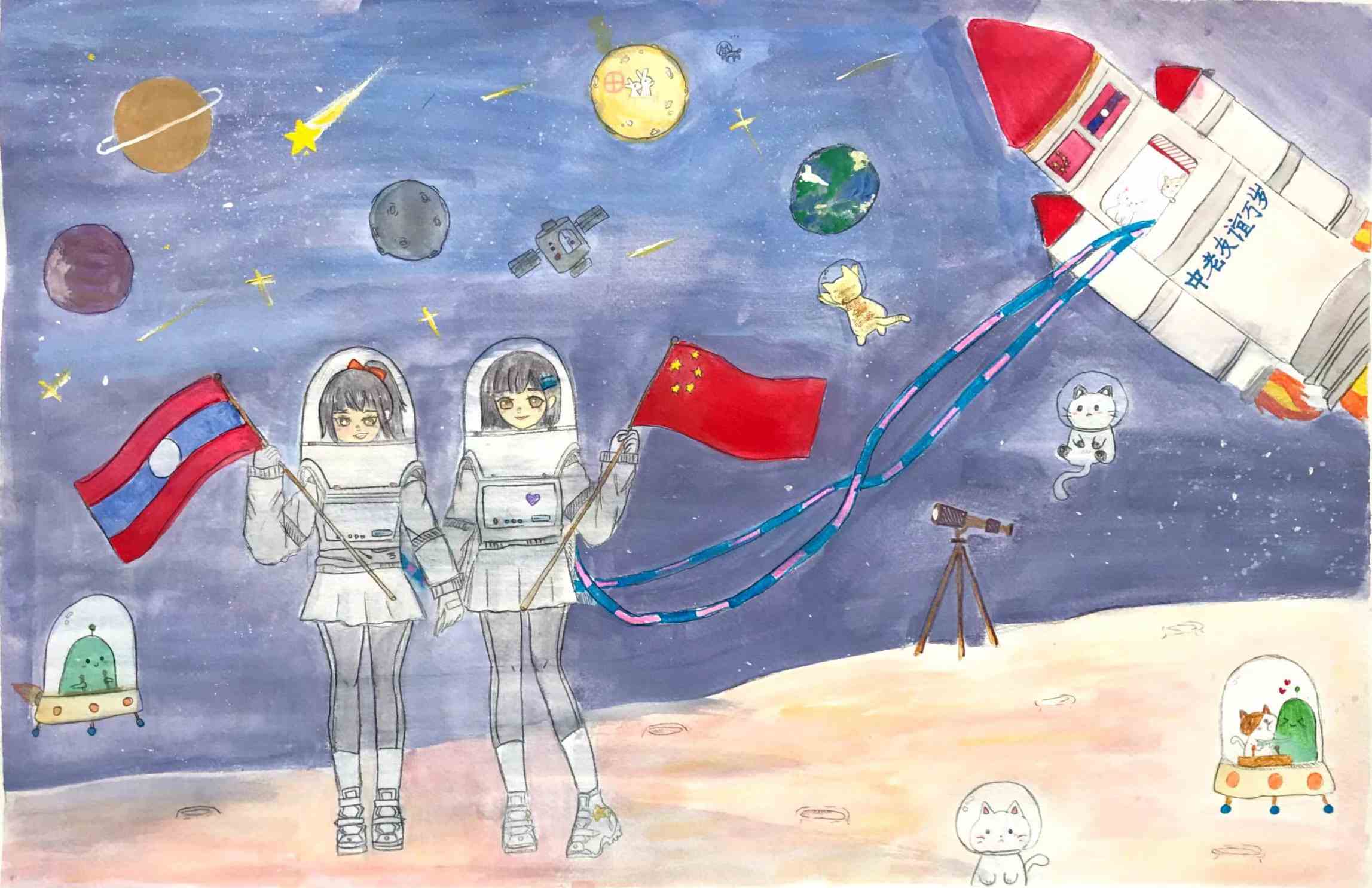 航天日绘画作品《相亲相爱的我们》,老挝瓦蕾婉·彭马拉