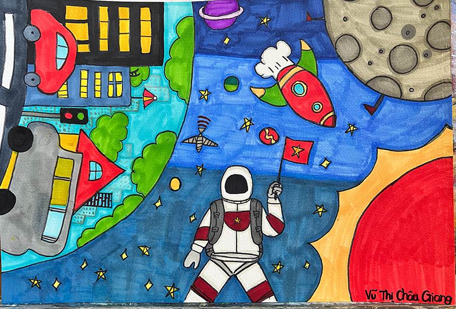 航天日绘画作品《遨游星海》,越南武氏珠江