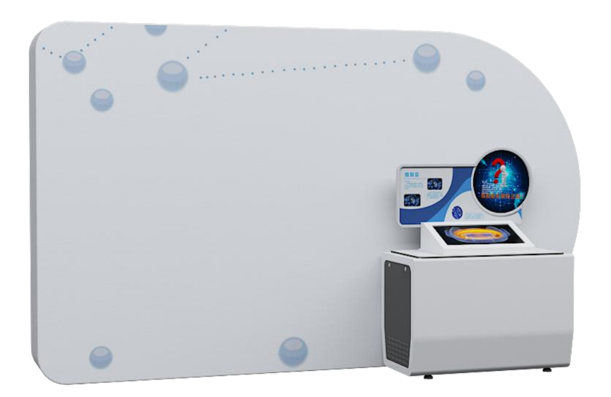 本展项主要由展台和触摸屏构成,触摸屏中展示的内容是模仿2048游戏制成的元素版2048游戏。这款化学2048游戏操作简单,其操作方法和2048游戏非常相似。观众按下触摸屏初始界面上的“开始游戏”字样,根据游戏操作提示开始合成新元素游戏。滑动触摸屏,合成游戏指定的新元素。游戏结束后,观众可以看到自己的得分情况。