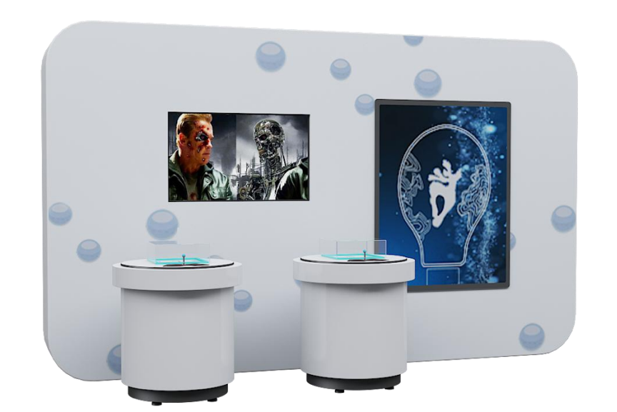 本展项主要由展台、多媒体屏幕和展墙组成,主要展示液态金属在一定条件下的运动和形态变化。多媒体播放液态金属生命展示短片,观众可以观看短片,了解液态金属的独特属性与应用。展墙设置了一幅液态金属画,观众在液态金属画前,挥手靠近金属画,无需接触,金属画就会被点亮。展台上设置了液态金属和液态金属反应环境,观众可以操控展台上的操作杆,控制液态金属的运动方向与形态。