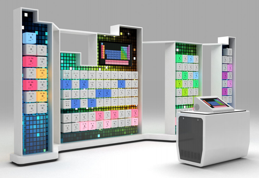 本展项设置几栋底部连接、颜色各异、错落分布的大楼,上面分布元素周期表窗格,每个窗格均放置相应元素的实物,共展示81种元素的单质、化合物、矿物;部分气体、放射性元素无法展示实物,以文字介绍相关元素知识。让观众更加直观地了解元素周期表中的各种元素及其实物,了解各个元素在周期表中的位置,了解各个族、周期元素的性质。