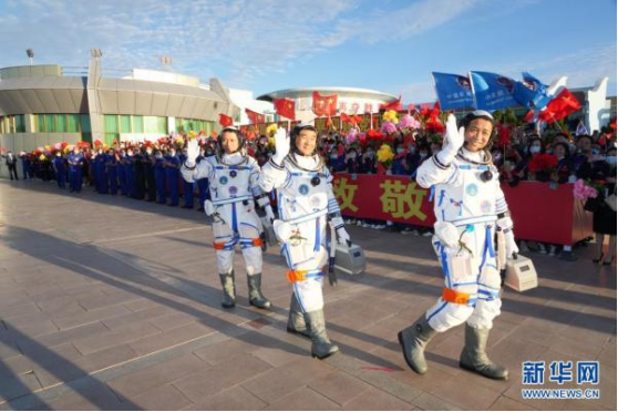 (2021年6月17日,神舟十二号航天员出征仪式在酒泉卫星发射中心举行。这是航天员聂海胜(右)、刘伯明(中)和汤洪波在出征仪式上挥手。新华社记者 李刚 摄)