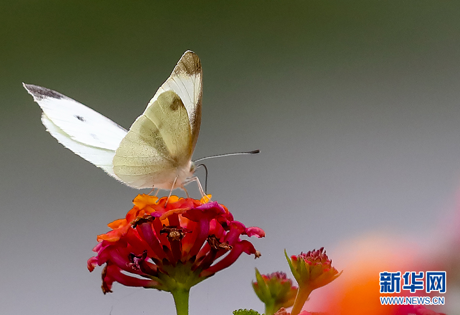 (一只蝴蝶在花上采花粉。 新华网发(陈其松摄))