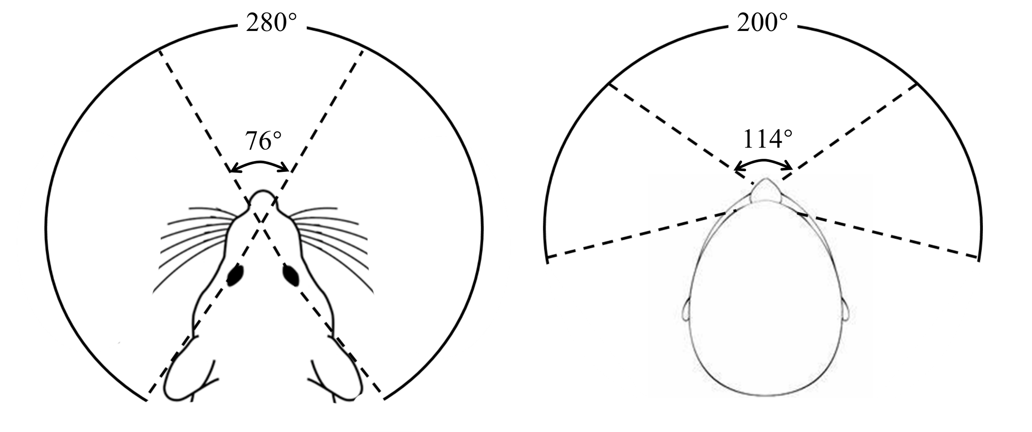 虽然老鼠视力极差,但是它们也有大视野。老鼠的眼睛位于头部两侧,虽然“双眼视野”较小,看东西定位不准,但视野范围高达280°以上(而人类只有200°左右 ),这也就意味着鼠类能更早地发现捕食者,从而提前逃跑!