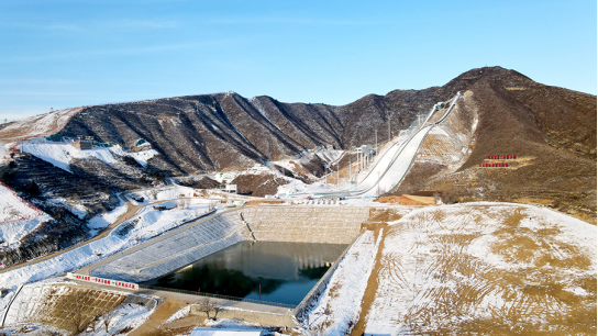 2020年12月,随着跳台滑雪和北欧两项国家集训队顺利进驻开展训练,由中国铁建所属中铁十六局承建的2022年北京冬奥会三大国家级冰雪运动训练基地之一——河北涞源国家高山跳台滑雪训练科研基地一期项目正式投入使用。图为跳台造雪完成