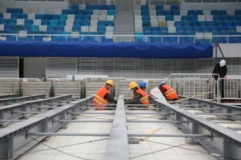 可转换钢结构由2600根3米高、2米长的薄壁H型钢搭建而成,每根梁柱装有柱脚,每个连接点装有可拆卸高强度螺丝,确保钢架坚固结实。作为支撑冰面“骨架”的一部分,制冰基础层施工也十分重要,冰面下有制冰管、保温层、防水层、预制混凝土块层、钢梁和钢柱,共有100吨左右的结构,由3000个左右的构件拼接而成。