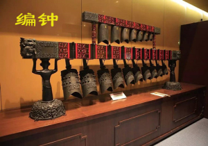 编钟是我国古代重要的打击乐器, 用青铜铸成,由大小不同的扁圆钟按照音调高低的次序排列起来,悬挂在一个巨大的钟架上,用木棰敲击发音,音色清脆、悠扬,穿透力强。