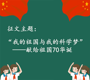 本次征文活动主题为:“我的祖国与我的科学梦”——献给祖国70华诞,并设置小学生、初中生、高中生三个组别。旨在为引导广大中小学生畅想祖国的科技振兴、人民的美好生活和个人的积极进取,自觉把科学梦与中国梦、把个人成长进步与祖国未来发展紧密联系起来,从小热爱科学、服务科学、励志科学,为建设科技强国、实现中国梦的征程而奋发进取。
