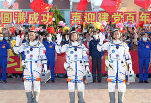 6月17日,神舟十二号航天员出征仪式在酒泉卫星发射中心举行。这是航天员聂海胜(中)、刘伯明(右)和汤洪波在出征前挥手。新华社记者 李刚 摄