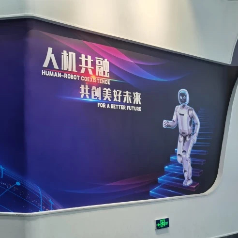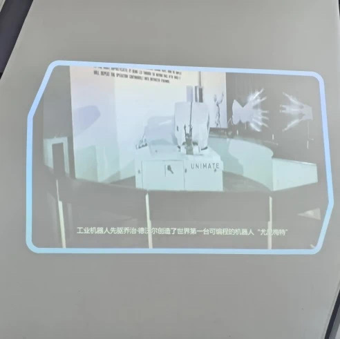 这里是我们展厅的入口,大家一起来看一看这副图文版以及右侧的投影画面,我们会为大家盘点国内外最具代表性的机器人系列,和最前沿的机器人科技。小朋友们,你们期待吗?