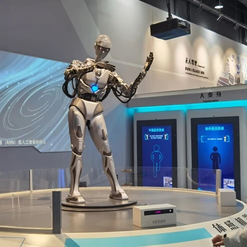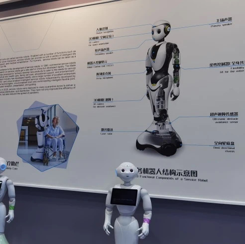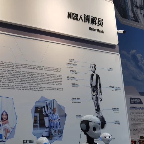 展品利用服务型机器人定时在展厅巡视,并为观众提供讲解、答疑等智能化展览服务。让观众了解在未来生活中,服务机器人可在助老助残、家庭服务、医疗康复、救援救灾、能源安全、公共安全、重大科学研究等领域融入我的生活,成为我们生活、工作、学习的助手。