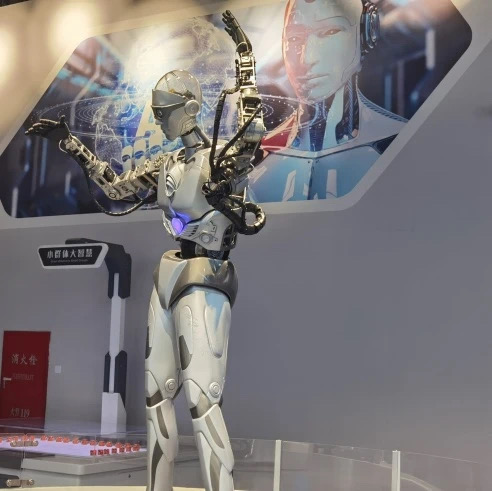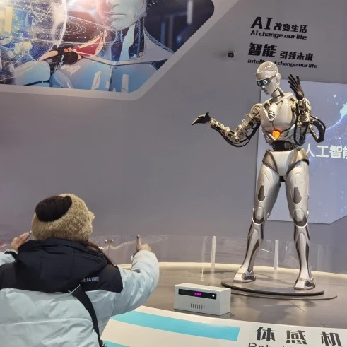 这是体感机器人,别看他浑身都是钢筋铁骨,体操、瑜伽、太极拳它可是样样精通。它是体感技术与机器人控制技术的巧妙结合,大家可以通过肢体动作来控制机器人运动。