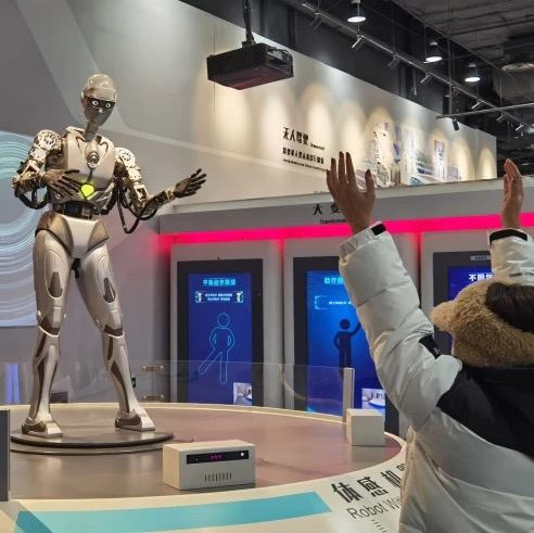 这里有两个体验区,机器人会根据你们站到体验区的先后顺序,依次转动身体,面向你们来合作。机器人前方的体感器可以识别和采集你们身体上各个关节点的运动数据,经过系统转换和处理后,与机器人的活动关节进行绑定,实现同步运动。此外机器人还能根据您的年龄、性别、衣着颜色等建议您做出动作和面部表情。合作完成后还会对您的动作进行点评哦。非常有趣,快来试试吧!