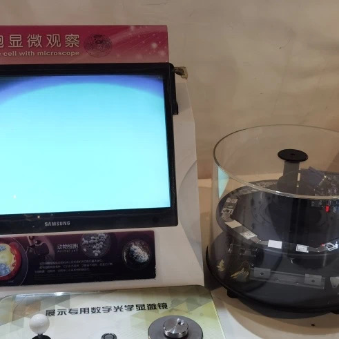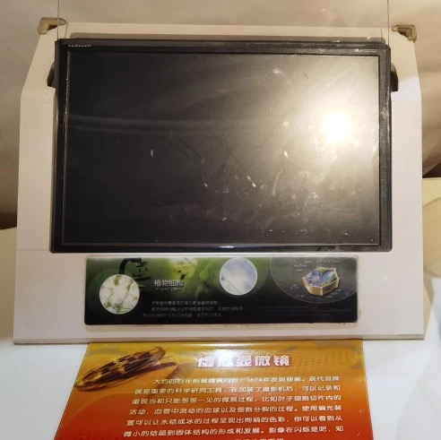 构成生物体的最基本单元是细胞,这件展品叫做细胞显微镜的观察。在四百年前列文虎克,发明了第一个显微镜。通过他我们看到了以前人们所没有看到的微观世界。我们可以知道不同的细胞,有不同的结构,有不同的功能。就比如说植物细胞,相对于动物细胞来说,它有细胞壁,有液泡还有叶绿体,而这些都是动物细胞所没有的。通过这件展品我们可以操作它来控制显微镜,来看看不同的细胞切片有什么样的功能和特点。