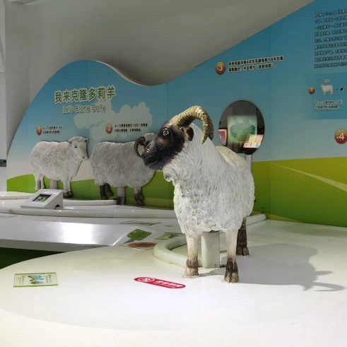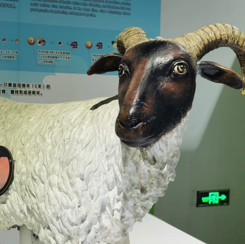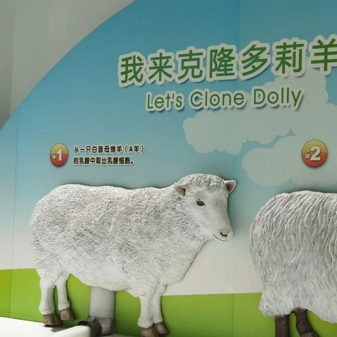 这件展品为我们展示了克隆羊技术的实施过程及相关原理。那什么是克隆呢?克隆是指生物体通过体细胞进行的无性繁殖,以及由无性繁殖形成的基因型完全相同的后代。克隆也可以理解为复制、拷贝,就是从原型中产生出同样的复制品,它的外表及遗传基因与原型完全相同。